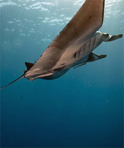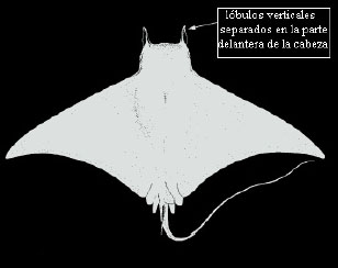 Tamaño: 650cm de largo y 300cm de ancho (máximo 520cm) Estado de conservación: Considerada EN PELIGRO en el Mediterráneo y a nivel global (IUCN); Convención de Berna, Anexo II; Convención de Barcelona, Anexo II. Población mediterránea muy reducida. Importancia pesquera: Ocasionalmente, ejemplares capturados de forma accidental en artes de pesca. Comentarios: La presencia de esta especie en el Mediterráneo español es muy poco habitual y cada vez menos frecuente. M. mobular se ve afectada negativamente por la pesca y el deterioro de su hábitat. |